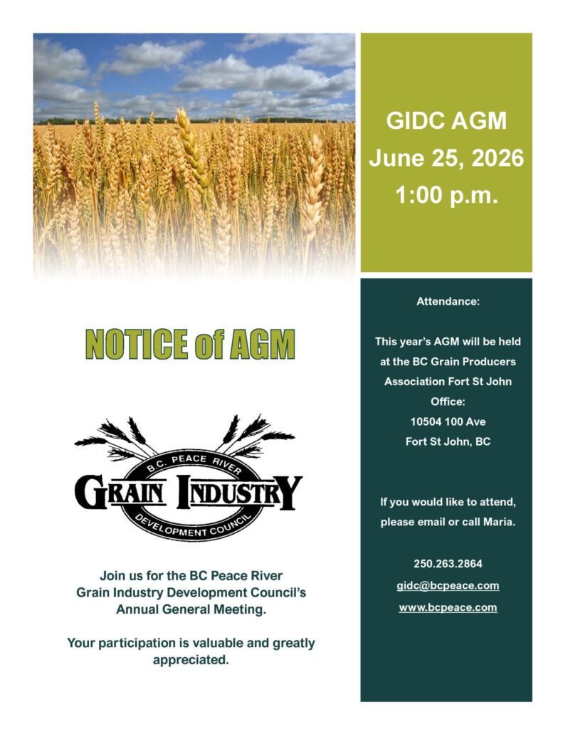 Since 1990, the BC Peace River Grain Industry Development Council has been actively involved in the research and development activities for this area which produces almost 90% of the province’s grain and 95% of the canola. Council administers four levies on grain, oilseed, pulses, and forage seed crops grown in the BC Peace River Regional District. This amounts to nearly $1.3 million contributed to projects which improve and enhance the viability of this very important sector of the provincial economy.